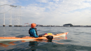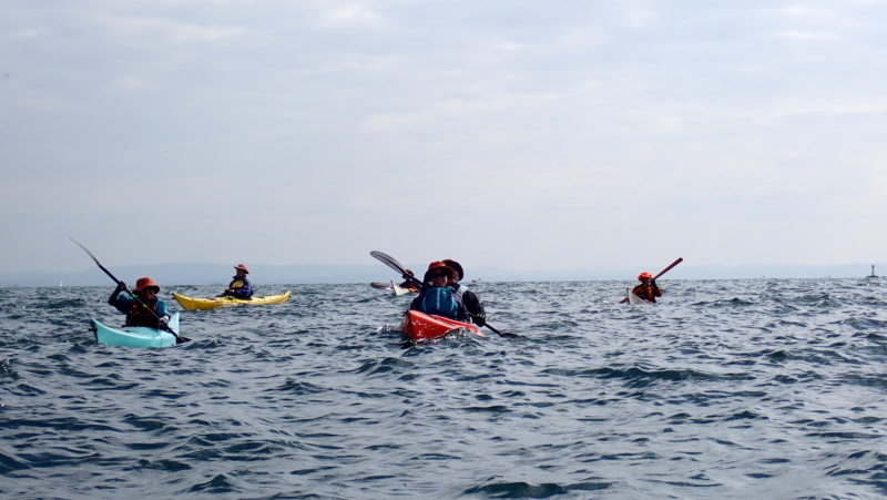今日は南風の予報でしたが、実際には北風で曇り空でした。肌寒く、波も高く不規則で緊張感がある中での練習会となりましたがみなさんうまく乗りこなして何だかんだと白灯台から八景島へまわるロングコースを楽しまれていました。道中、海苔の筏が出ていました。また渡り鳥を観察する人たちも大勢いらっしゃいました。この海域での晩秋から冬にかけての風物詩ですが季節の移ろいを感じさせてくれました。こういった四季を体感させてくれることもシーカヤックの魅力のひとつですね。いよいよ冬がやってきます。