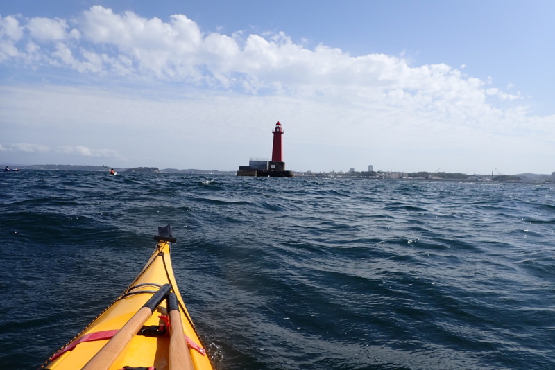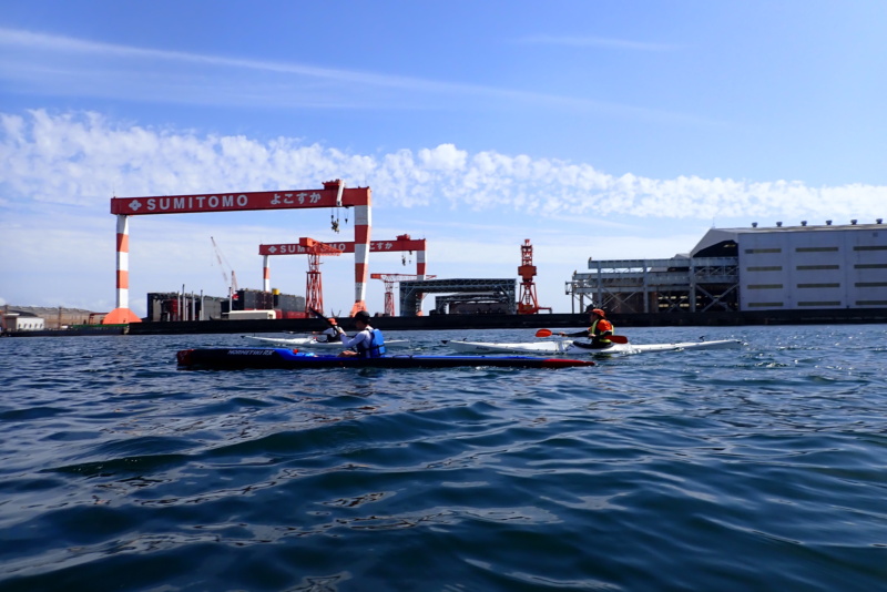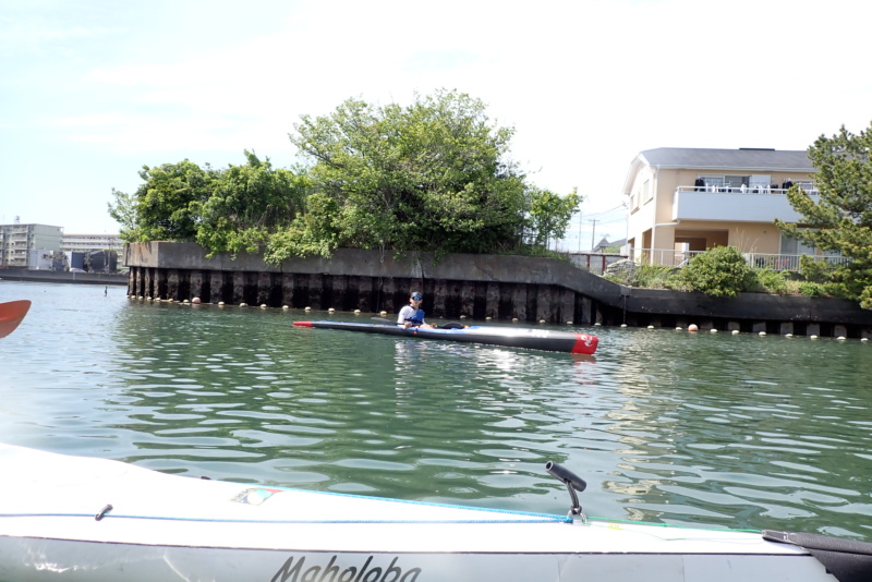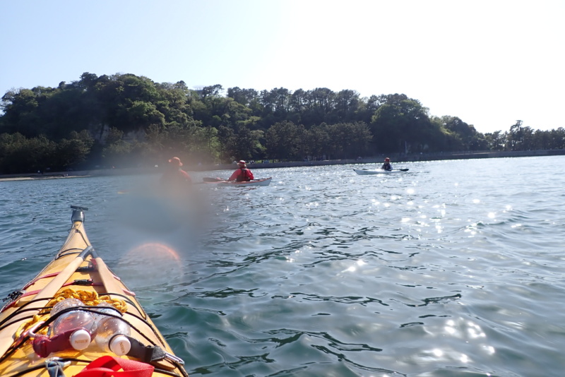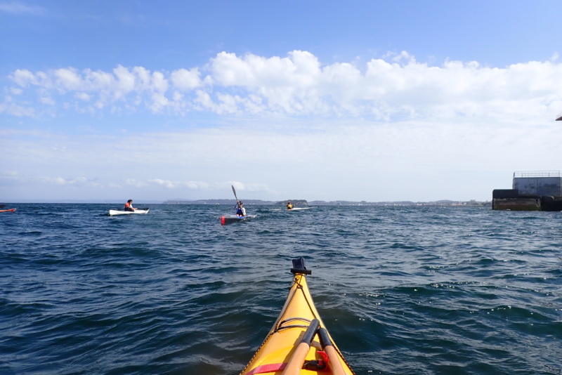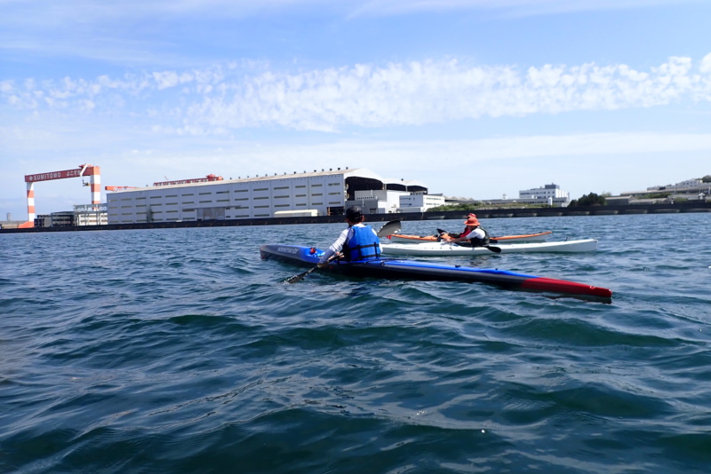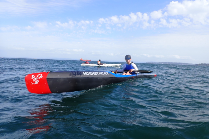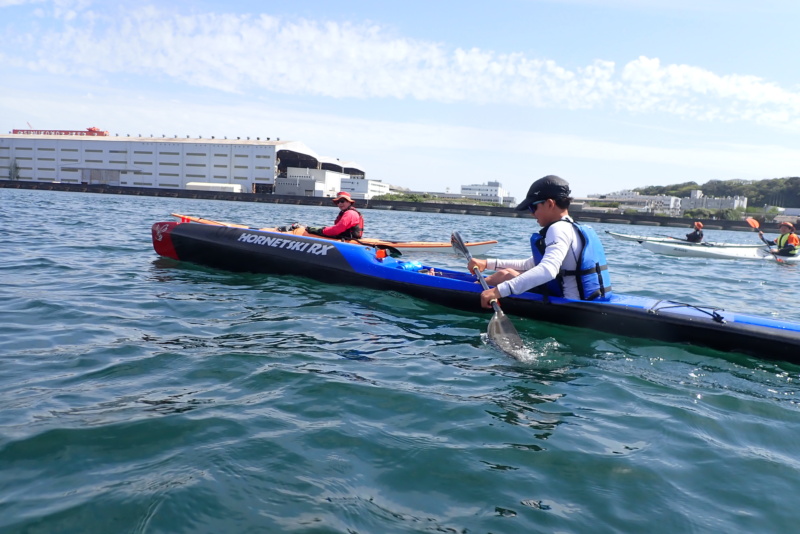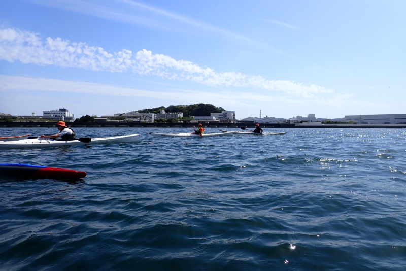 午後は、午前に比べ日差しがさらに強くなり、風と波が出てきました。南風4m/s、波高は30cm程度でしたかね。さて、今日は、なんとサーフスキーの練習にお付き合いすることになりました。近々、個人的にサーフスキーレースへ出場するメンバーがおりまして、そのメンバーが沖合で練習をしたいとのこと。我々は、そのサポート役です。といっても、我々は、サーフスキーには乗れませんので、いつものシーカヤックで出艇です。風や波がある中で漕いだ時に、何かあったら助けに行くつもり参加をしたのですが、猛スピードで進むサーフスキーのペースに、ついていくだけで必死。腕がパンパンになりました(笑)風も波もありましたが、全く問題もなく、そのメンバーも楽しそうに漕いでいたのが、なんだかこちらも嬉しく思いました。